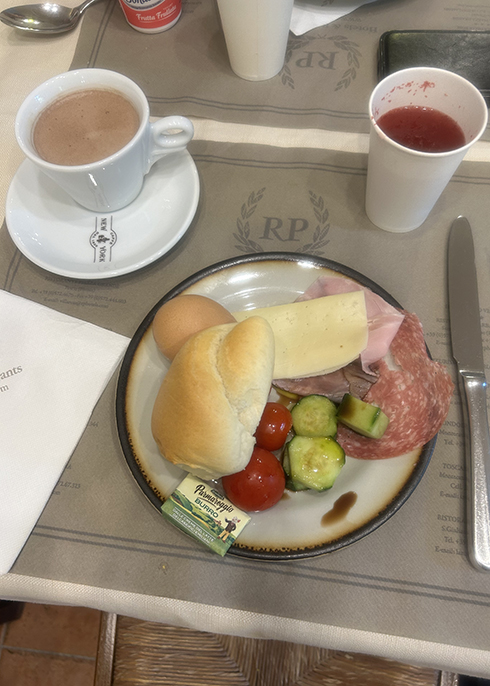 The Continental breakfast was much the same as all our hotels, an assortment of meats, cheese, fruit, cereal, rolls, and yogurt. We had a choice of juices—including blood orange juice which was very good—tea, coffee, and chocolate. One of my takeaways from this trip is that Italians know how to do chocolate. I had seconds both mornings we ate at Albergo Diffusio. So good.